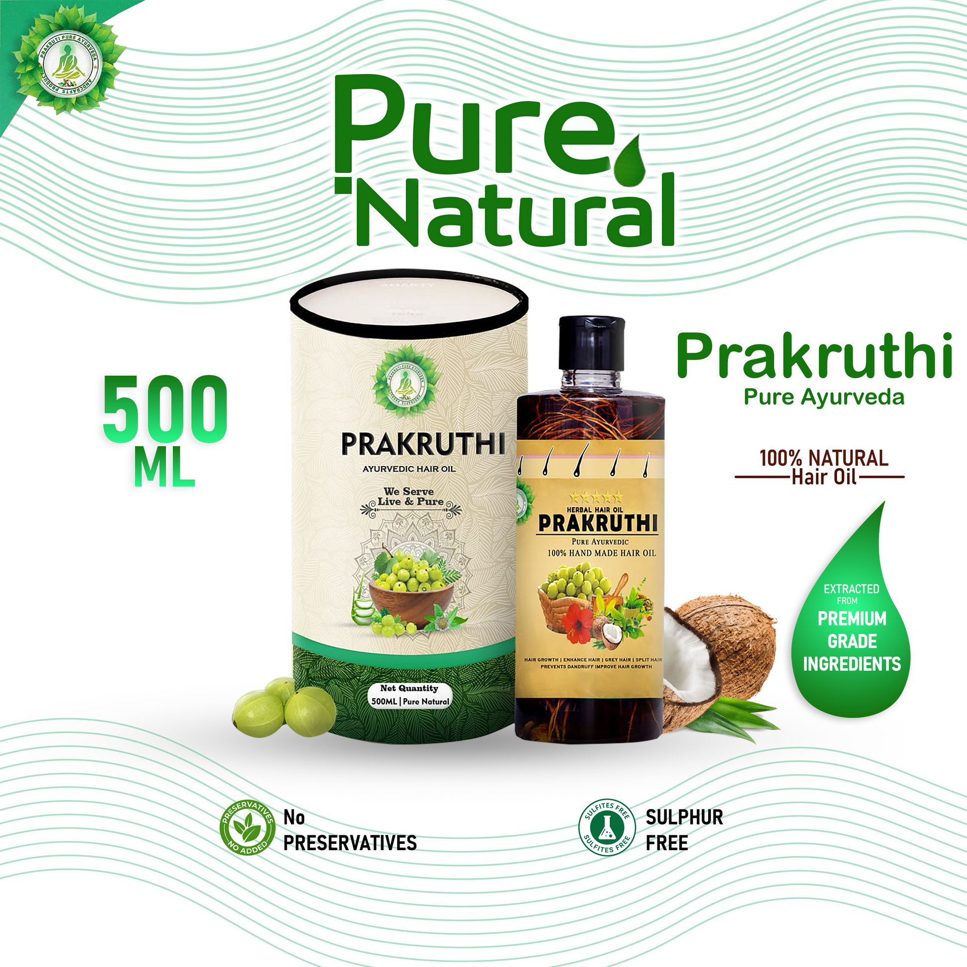 Coconut oil: Cold-pressed coconut oil acts as a carrier oil and provides deep conditioning, moisturizes the hair, prevents protein loss, and strengthens the hair shaft.